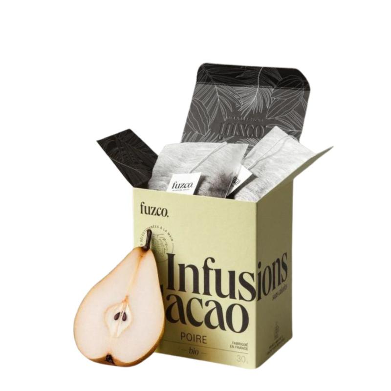 Ingrediënten : cacaobonenschillen*, natuurlijk perenaroma*, cacaonibs*, natuurlijk bourbonvanillearoma.
